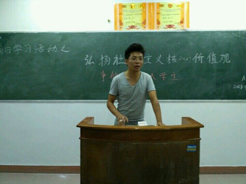 活动中,各班团支书首先向同学们介绍了二十四字社会主义核心价值观及六有大学生的具体内容,让同学们简单了解其含义。紧接着,各班以本次活动主题,开展形式多样、内容丰富的系列互动活动。在演讲中,同学们对于活动主题的理解深入中肯,他们浑厚有力的语调,为台下的同学呈上了一次听觉盛宴。在竞答环节中,同学们踊跃参与,现场气氛甚是活跃。有的班级则与其他班级进行了一场别开生面的辩论赛,在唇枪舌战中,尽显同学们的才华与学识。