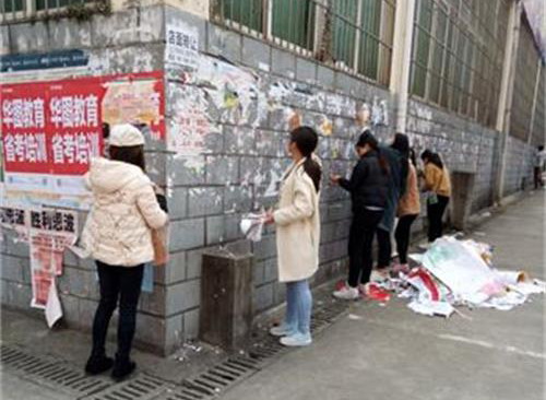 志愿者团队在三食堂广场集合完毕后,24个志愿者分为三组分别开始行动。起初墙上的小广告较容易清理,志愿者们用小铲子便能撕下;随后还剩下一些难以擦除的“牛皮癣”,志愿者们充分发挥永不退缩精神,他们先用水泼洒,将其浸泡,再用铲子仔细清刷。经过1个多小时的努力,共清理乱张贴小广告60余处,三食堂广场的墙壁干净了许多。最后,全体志愿者合影留作纪念为此次活动画上圆满的句号。