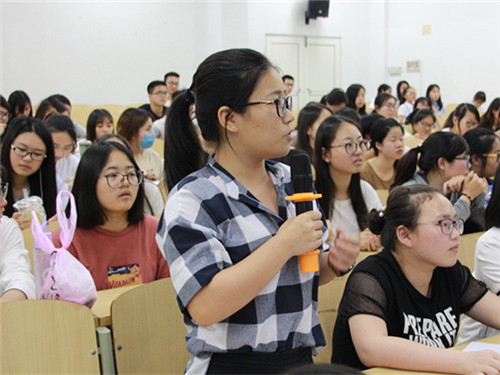 交流会分两个环节进行。第一环节为“经验交流”:四位优秀考研代表分别就何时开始准备考研,购买何种教辅材料,具体的学习经验和方法,考试前如何调整心态,如何分配备考时间等颇受关注的方面讲述了自己的经历与经验,台下同学认真倾听,时而奋笔疾书,时而低头深思。其中考研代表邱哲航学长以其独特的思维学习方式进行了专项例题讲解,让同学们收获了新的思考方式,开辟了考研新思路。四位代表考研方向和学习方法各不相同,让参与此次交流会的同学们受益匪浅。第二环节“解疑答惑”:在场同学们积极询问,嘉宾们也耐心解答,同学们收获颇丰,加深了关于考研的认知与了解。最后,交流会在一片热烈的掌声中结束。