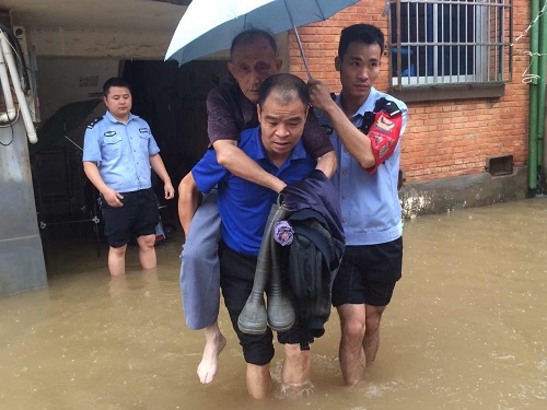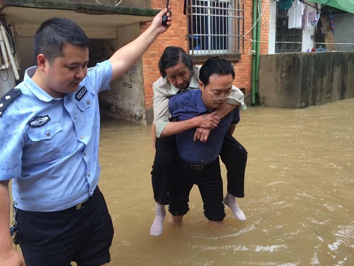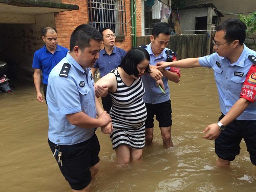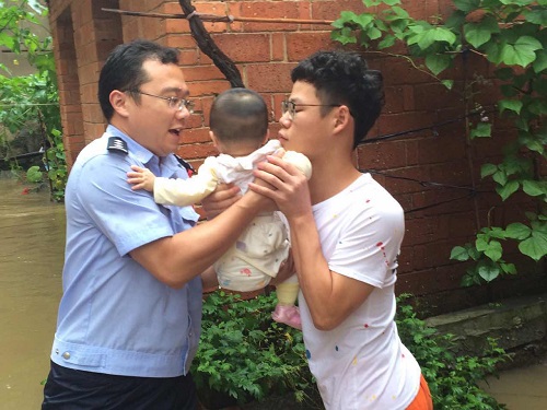 现场,南康镇党委书记邹金才、党委副书记陶书荣正在指挥紧急转移受灾群众7户22人。见到这番景象,活动队的老师、队员们纷纷挽起裤脚,打着赤脚随邹书记、陶副书记和民警们一同走进洪水之中。赖亚汝老师背起了腿脚不便的老爷爷蹒跚前行,艰难但又稳健。他的全身已经不知是雨水还是汗水湿透。湿润的还有老爷爷的眼角,“不是亲人,胜似亲人啊”,老爷爷感动地说道。邹挺同学从警察的手里接过了婴孩,大家接力似的抱过这个孩子。活动队的老师和同学们一直忙着转移居民,其中有不少老人、孕妇和小孩,大家同心协力,最终将受灾居民全部转移到安全地带。