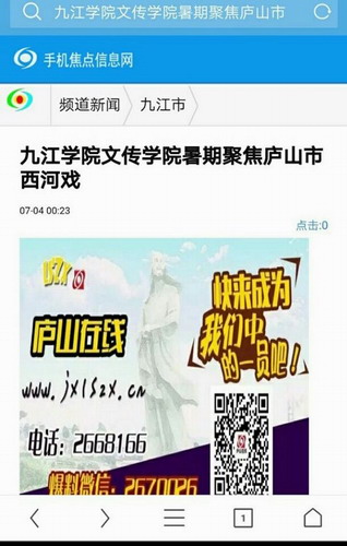 继庐山市电视台及新浪网江西资讯头版报道后,7月4日,江西信息港与焦点信息网再次发布了文传学院暑期“三下乡”聚焦庐山市西河戏活动信息。
