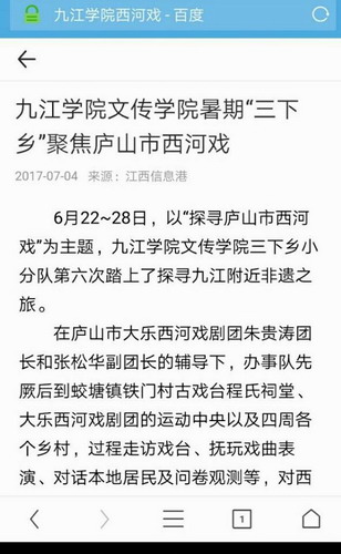 6月下旬,文传学院“三下乡”服务队前往庐山市各地走访调研,探寻非遗文化,聚焦西河戏。日前,九江学院微信公众号据此推出“九江学院文传学院暑期‘三下乡’聚焦庐山市西河戏”一文。7月4日,江西信息港与焦点信息网两大网站转载此文并注明出处及版权。