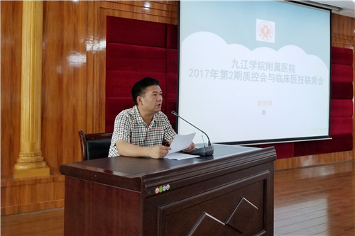 近日,临床医学院/附属医院2017年度第二期质控会暨临床医技科室联席会在行政办公楼九楼会议室召开。纪委刘英明书记、刘晓平副院长,各临床医技科室主任、质控员、临床路径管理员及相关职能部门负责人参加了会议,会议由纪委刘英明书记主持。
