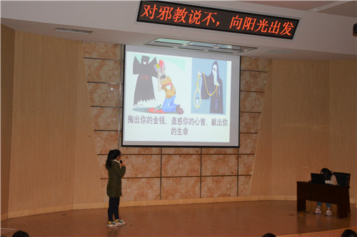 活动伊始,讲解人通过PPT放映从邪教的概念、特征、危害、宣传方式、宗教与邪教区别五个方面为同学们深入剖析了反邪教的原因。宣传活动的过程中还插入了心有灵犀一点通、反邪教知识竞答两个游戏环节,加强了活动的趣味性,调动了同学们的积极性。而后的创意情景剧表演更是以包青天审理邪教案件的新奇剧情吸引了大家的目光,加深了同学们对邪教危害的认识。