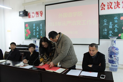3月21日下午,外国语学院在香远楼315室召开从严治党工作会议,学院领导,副科以上,教研室正副主任,党支部书记参加,会议由院长韩琨主持。