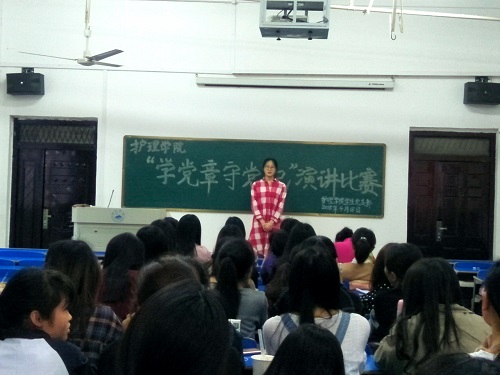 4月18日晚,护理学院学生党支部举办的主题为“学党章,守党纪”的演讲比赛决赛在华文楼101顺利举行,经过初赛的激烈角逐,15位选手脱颖而出,进入决赛。全体党员老师出席观看了此次比赛并担任评委。