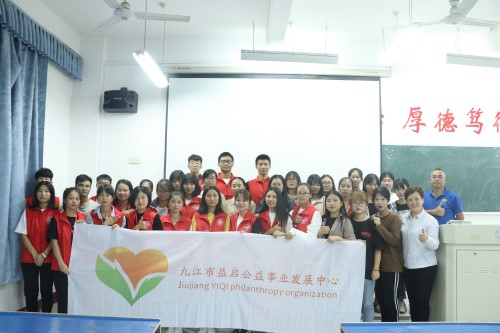 活动过程中,九江市益启公益事业发展中心创办人闵跃翔,一位有着朴素公益情怀的志愿者,一位“心如明月爱如阳”的公益人向志愿者们讲述了贫困山区孩子们的日常生活,并介绍了对接志愿者的基本工作。紧接着,九江市志愿服务联合会副秘书长欧书红采用让志愿者们提问的方式与志愿者进行了互动,不仅使现场气氛变得活跃,也使志愿者们对免费午餐活动有了一个更深刻的了解,并通过这次机会招选免费午餐微博活动的对接人,为志愿者队伍注入新鲜的血液。最后,志愿者们与老师们留下了温馨的合影,为此次活动画上了一个圆满的句号。