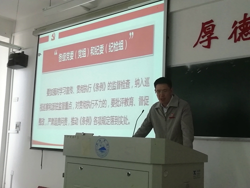 会上,花书记首先介绍了新修订《中国共产党纪律处分条例》的背景和意义,随后结合十九大报告中的“8个明确”“14个坚持”内容,对《条例》修改的主要内容进行了解读。最后,重点讲解了新《条例》修订后的八大亮点,归纳为“一个思想”、“两个坚决维护”、“三个重点”、“四个意识、四种形态”、“五处纪法衔接”、“六个从严”、“七个有之”、“八种典型违纪行为”八点。