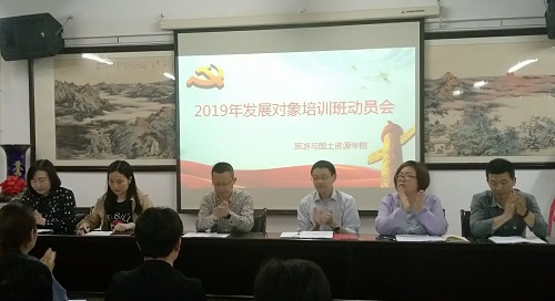 为提高发展对象思想认识,端正学习态度,5月15日中午,旅游与国土资源学院在竞知楼512会议室召开了2019年上半年发展对象培训班动员会。学院党委书记黄伟同志、院党委委员张建星同志、学生党支部全体支委、15名党员发展对象以及第159期入党积极分子共同出席本次会议。学生党支部副书记龚双双同志主持大会。